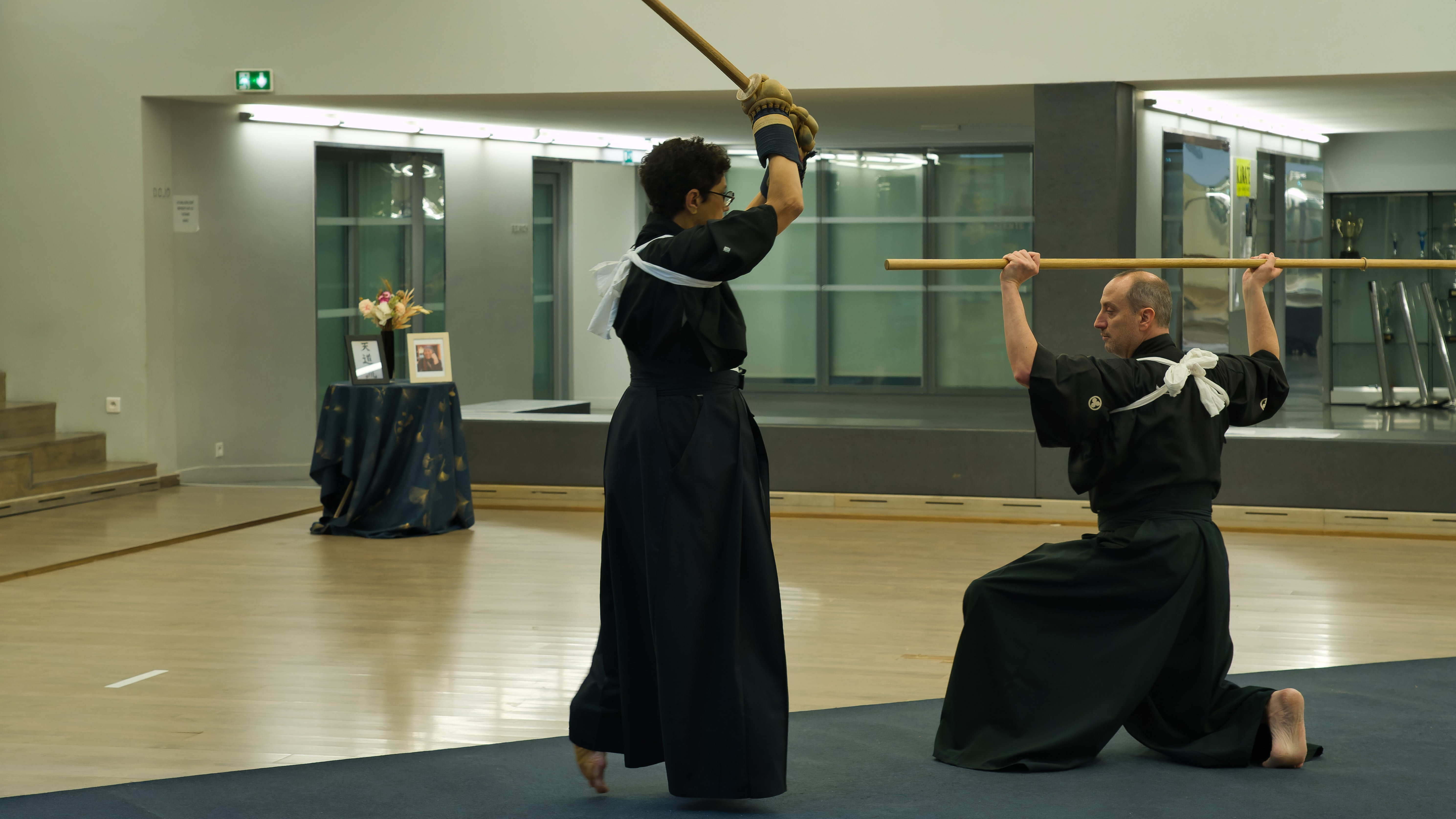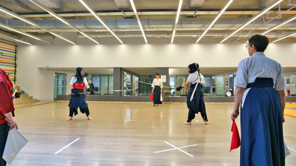 La première s’est révélée assez acrobatique car nous pratiquions notre discipline sur une petite scène où la manipulation d’une arme de 2 mètres demandait une certaine organisation. La deuxième a eu lieu dans un dojo qui s’est avéré un lieu plus approprié et où nous avons pu proposer un programme d’une vingtaine de minutes très complet : suburi (des coupes dans le vide), shikake (katas), shiai (combat) et tendo-ryu (katas réalisés avec une naginata traditionnelle).