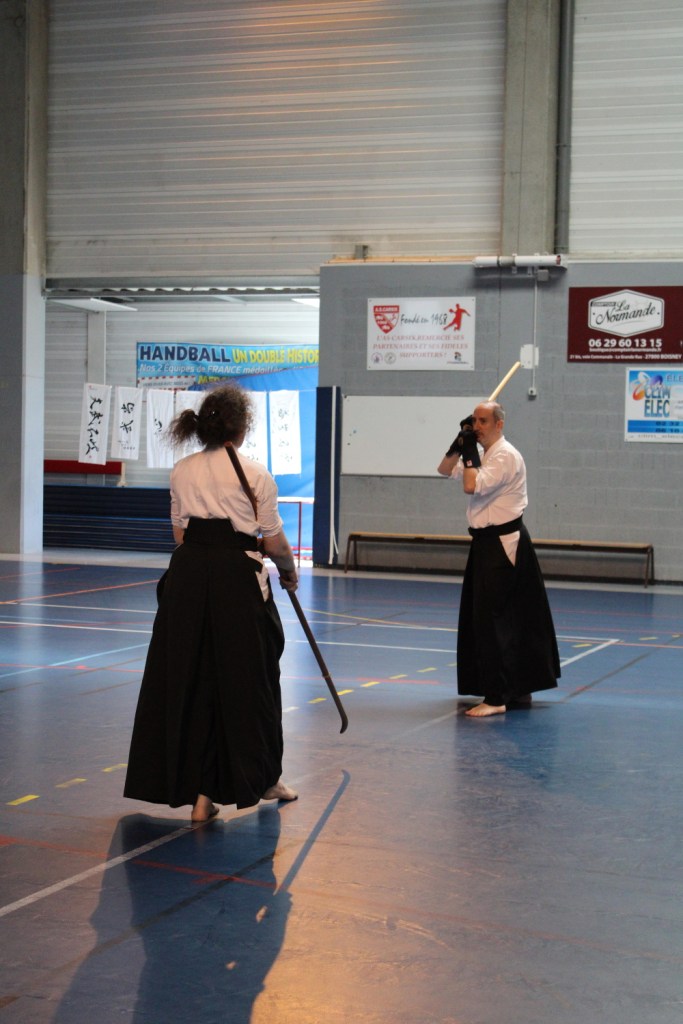 Comme tous les ans, le stage s’est terminé le vendredi après-midi par un Embu, c’est-à-dire une démonstration par paire (Tachi/Naginata) de 3 katas soumis à un cérémoniel stricte et en habit traditionnel appelé Monstuki (veste noire).