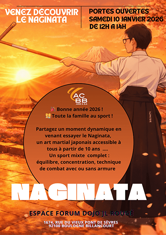 L’ACBB Naginata ouvre ses portes le samedi 10 janvier 2026 (de 12.00 à 14.00 ) pour vous permettre de découvrir en famille cet art martial japonnais.